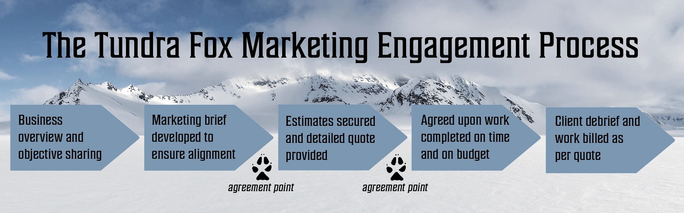 Tundra Fox Marketing uses a business process flow to ensure alignment and transparency with all of our clients. We believe there should be clearly defined marketing objectives and no surprises in our business journey together.
